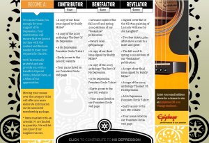 – Benefactor (500 dòlars): a més de tot l’anterior, els llibres que No Depression editarà la tardor de 2008 i la primavera de 2009, i un paquet amb CD i samarretes d’algunes de les discogràfiques que sortien a la revista.