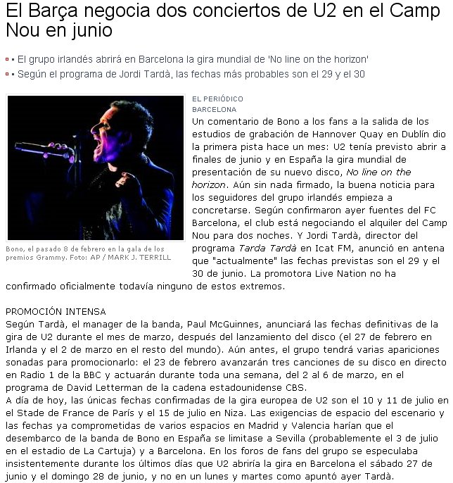 Estic fart dels qui converteixen rumors en exclusives –com el Jordi Tardà anunciant gires que ni el propi grup coneix- , i pitjor encara, dels diaris que es creuen o donen difusió d’aquests rumors –com va fer El Periódico el 15 de febrer amb l’anunci del senyor Paraula d’Stone amb les dates dels concerts dels U2 a Barcelona.