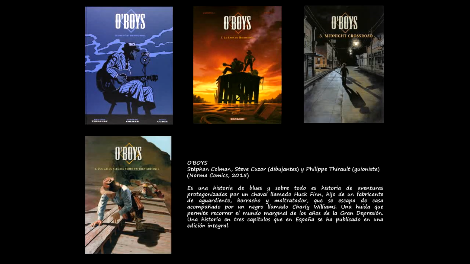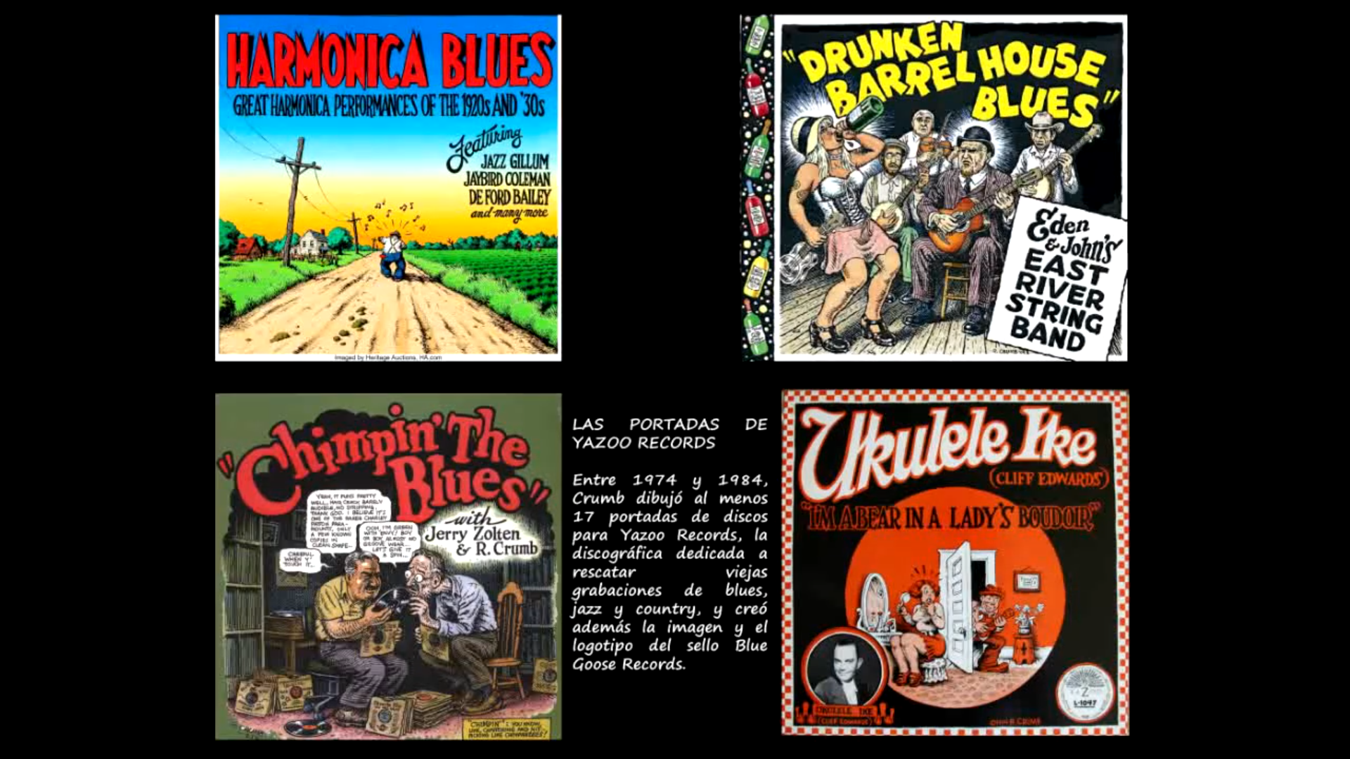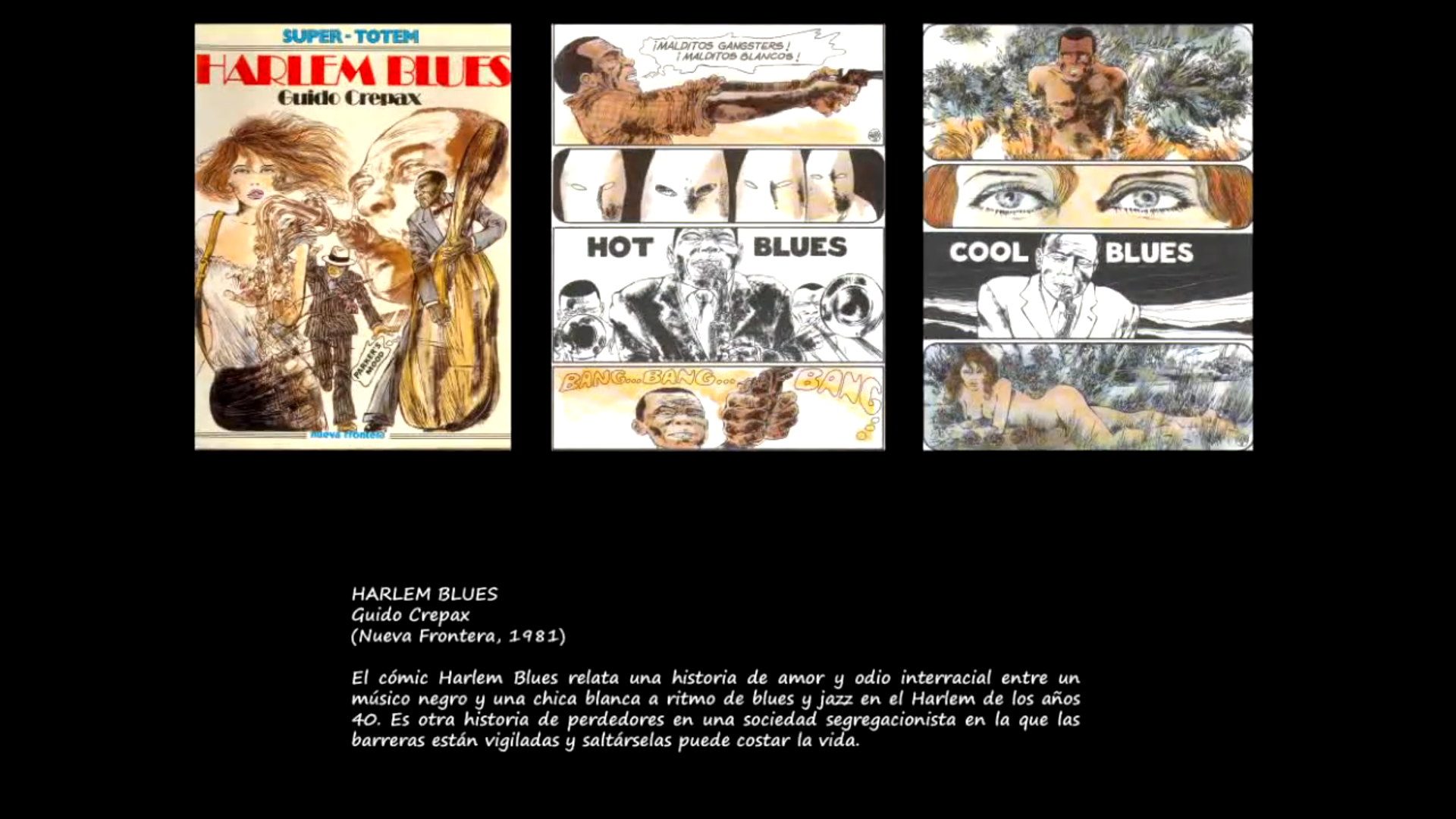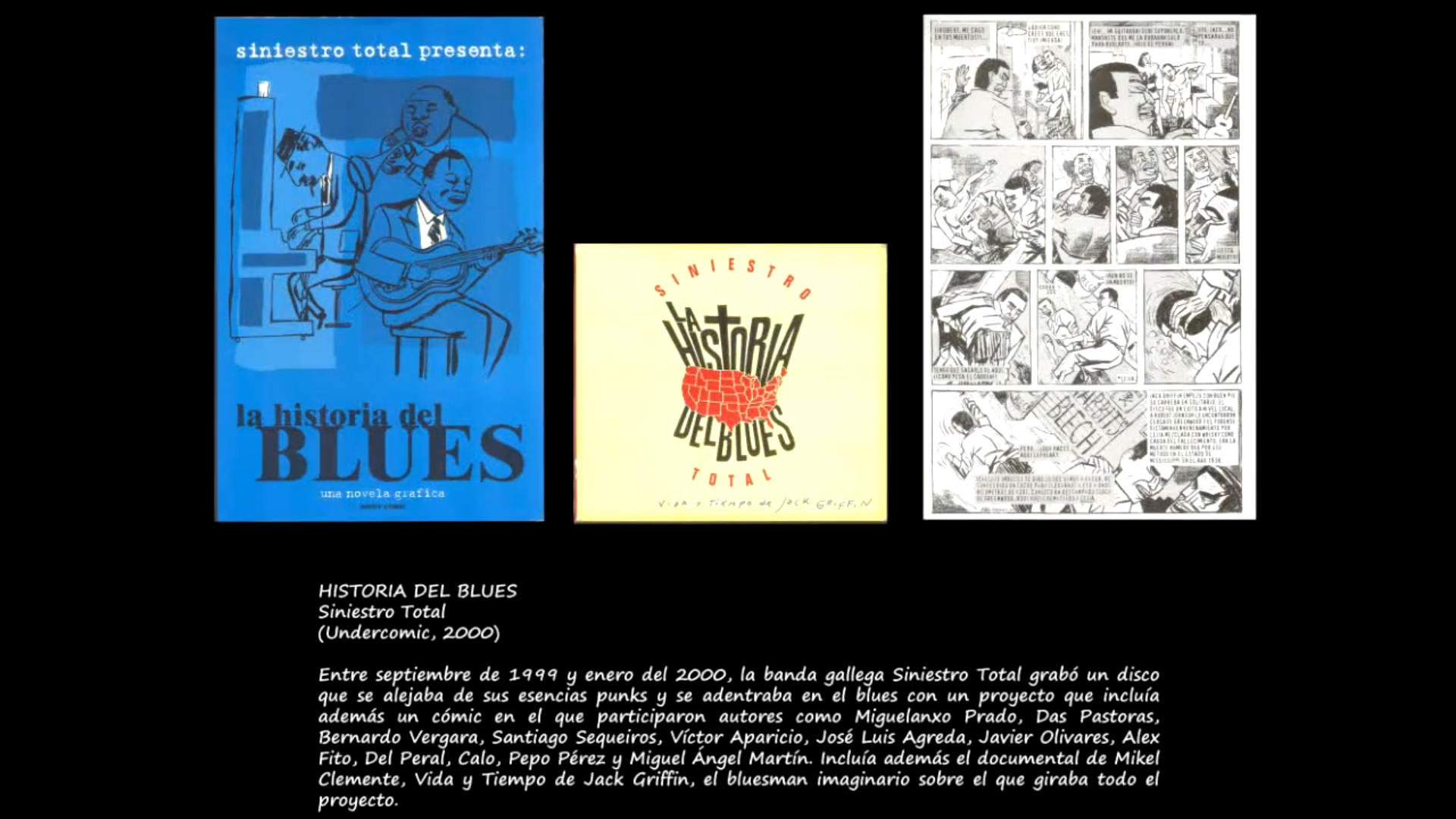 Viñetas al compás. Una historia de cómic y blues incluye, entre otras, obras de Robert Crumb –libros como Héroes del blues y portadas de discos para Yazoo Records–, Guido Crepax –Harlem Blues–, Rob Vollmar y Pablo García Callejo –la trilogía Bluesman–, Frantz Duchazeau –El sueño de Meteor Slim–, Stefano Casini –Moonlight Blues–, Angux y Núria Tamarit –Avery’s Blues–, Stéphan Colman, Steve Cuzor y Philippe Thirault –O’Boys– y J.M. Dupont y Mezzo –la biografía de Robert Johnson Love In Vain–.