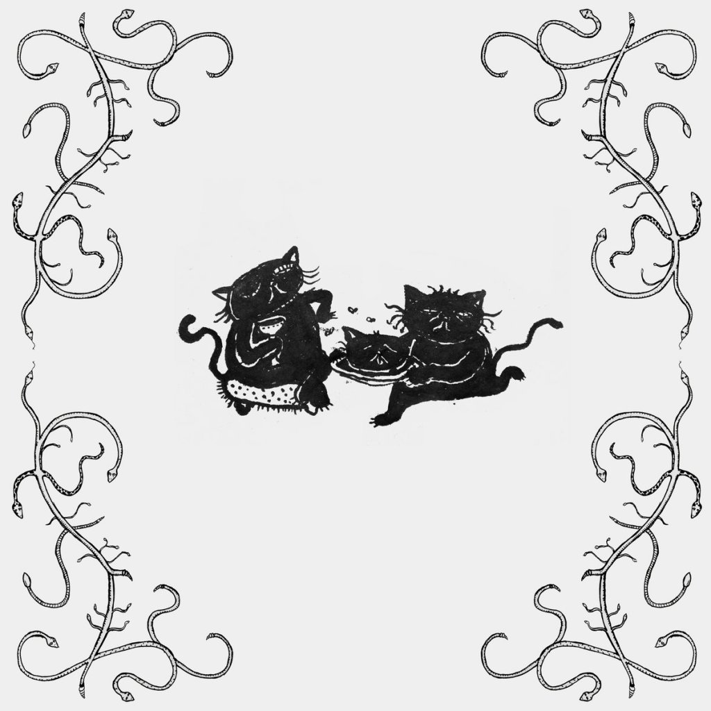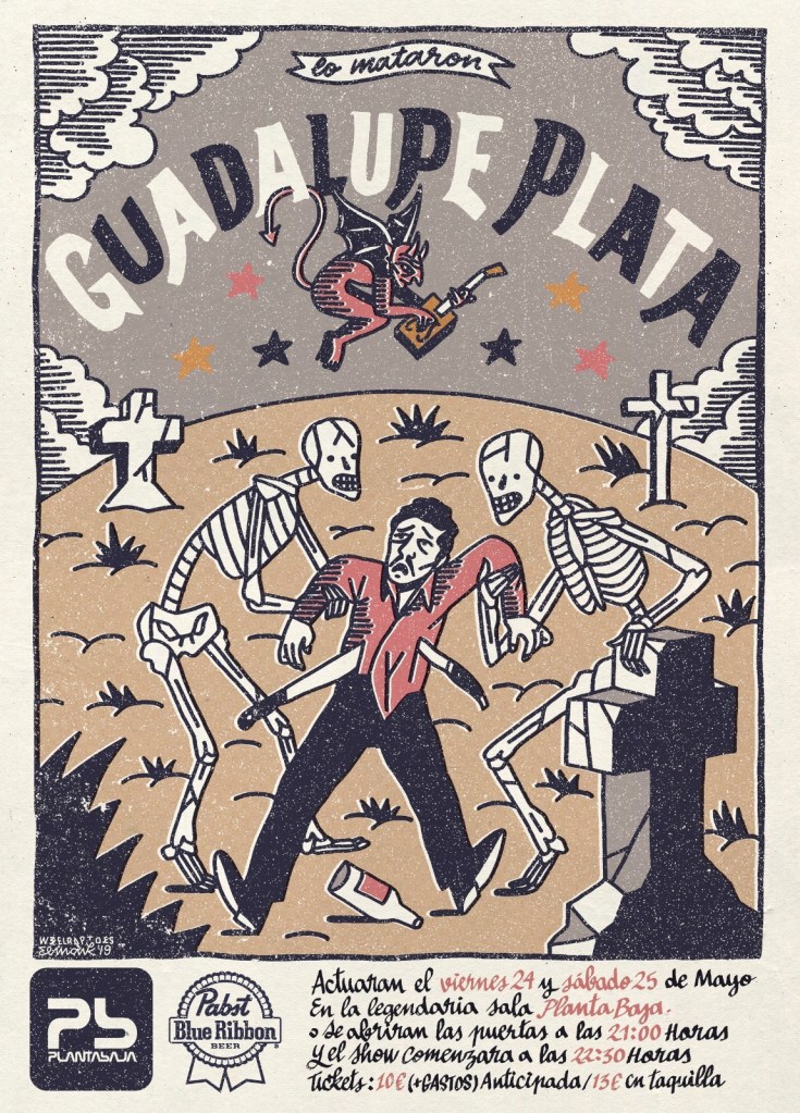 En vuestros textos e iconografía hay temas e imágenes que se repiten: cementerios, esqueletos, diablos, serpientes y animales variados, mujeres traicioneras, muerte, religión y un sentido del humor algo perverso. ¿Me dejo algo? Nos atrae mucho el mundo de la España Negra, los bares con serrín y las navajas manchadas de sangre.