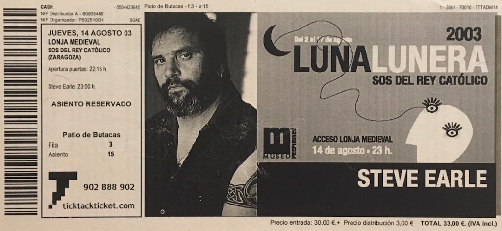 Steve Earle ha actuado en nuestras tierras en varias ocasiones y en formatos diferentes, solo o con banda, acústico o eléctrico, más orientado al folk o al rock. Tuve la suerte de verlo en su primera gira por el estado español en agosto de 2003, que solo pasaba por dos lugares: Sos del Rey Católico (día 14), y Bilbao (el 16).