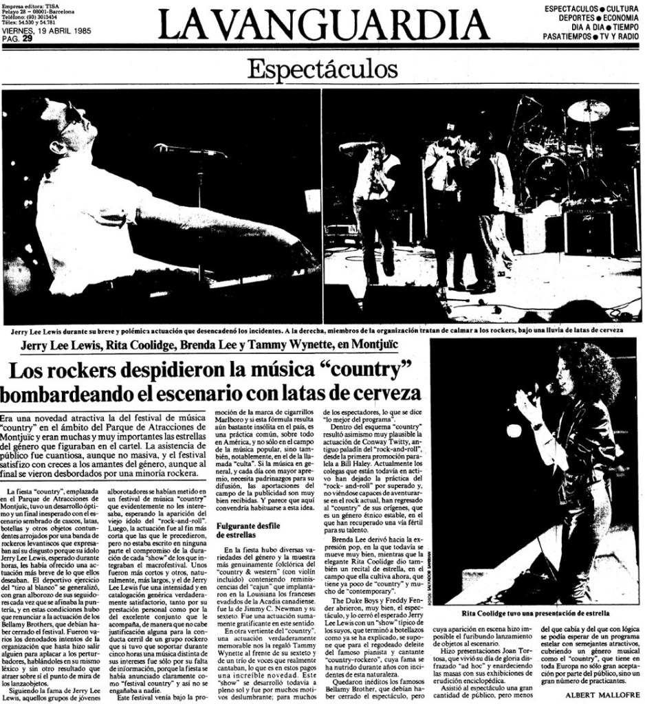 Oscar Rabadán: Sí, en el Festival Country Marlboro en Montjuïc, en 1985. Yo tenía 15 o 16 años. Me enteré de que tocaba Jerry Lee. También estaba Brenda Lee. Lo dejaron para el final. Primero recuerdo cuando salió al escenario, porque me impactó. Comenzó a tocar la banda y él apareció, andando muy chulesco, trajeado, fumando un puro y mirando a la gente arrogantemente. Actuó una media hora y la gente se cabreó porque querían que tocara más y el tío no quiso, porque tenía esta fama de huraño. Y se lio un pollo bastante interesante. Recuerdo que me tuve que meter debajo del asiento porque me volaban las botellas por encima de la cabeza. Como era un crío lo viví como una experiencia, salí de allí sobreexcitado. Y me encantó. Llevaba a James Burton a la guitarra, que ya lo había oído con Elvis. Y ver a esta gente en directo, para mí fue muy fuerte.